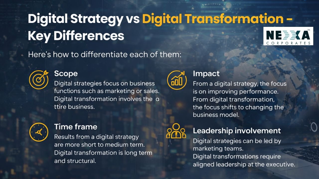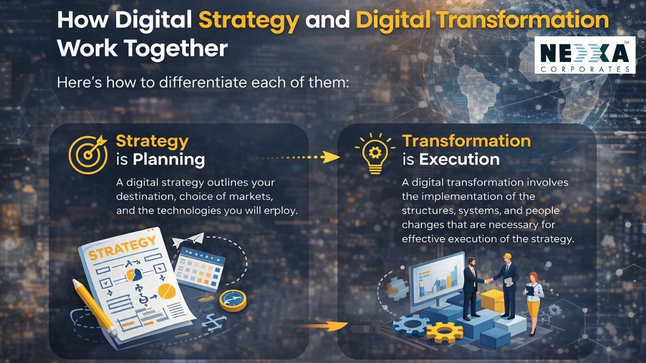 A Digital Strategy vs Digital Transformation discussion often highlights how planning differs from execution. In a Digital Strategy vs Digital Transformation context, digital strategy focuses on defining the vision, goals, and roadmap, while digital transformation involves the implementation of the structures, systems, and people changes that are necessary for effective execution of the strategy.